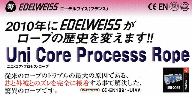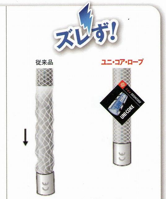 従来のロープは長期間の使用や、激しい衝撃等でシェススリッバー (芯と外被のずれ)が生じるが、ユニ・コアは全くそれがありません。 また、漣常のロープと比べて水中での収縮率が半分でもあります。