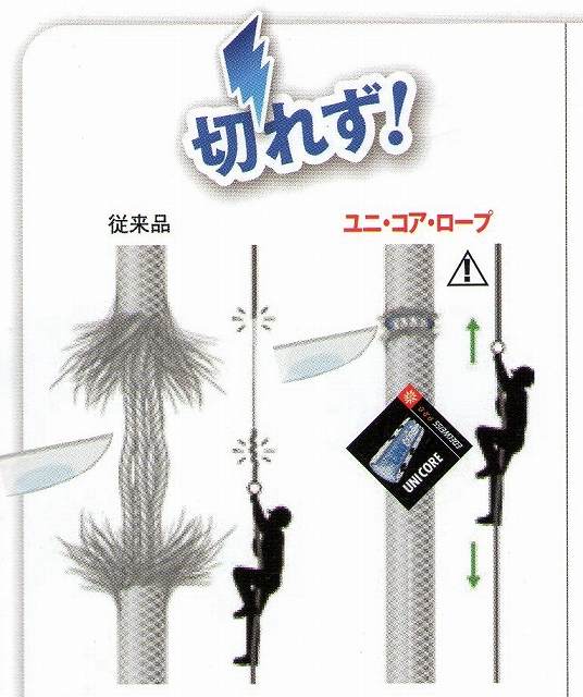 従来のロープは外被が完全に切れると、芯が伸びて危険な状態になるが、 ユニ・コアは一体のた危険な状態にはなりません。 激しいアツセンダーの使用やシャープエッジ部分での使用にも 威力を発揮します。